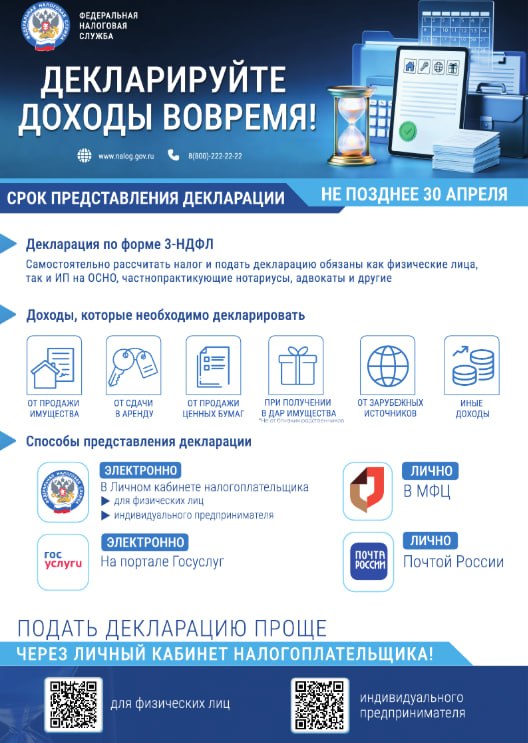 Напоминаем, на сайте ФНС России размещена промостраница, где даны ответы на наиболее популярные вопросы по декларированию гражданами доходов за 2025 год. Здесь собрана вся необходимая информация о том, кому нужно отчитаться о доходах, у кого отсутствует такая обязанность, подробно описан порядок заполнения и способы представления декларации.
