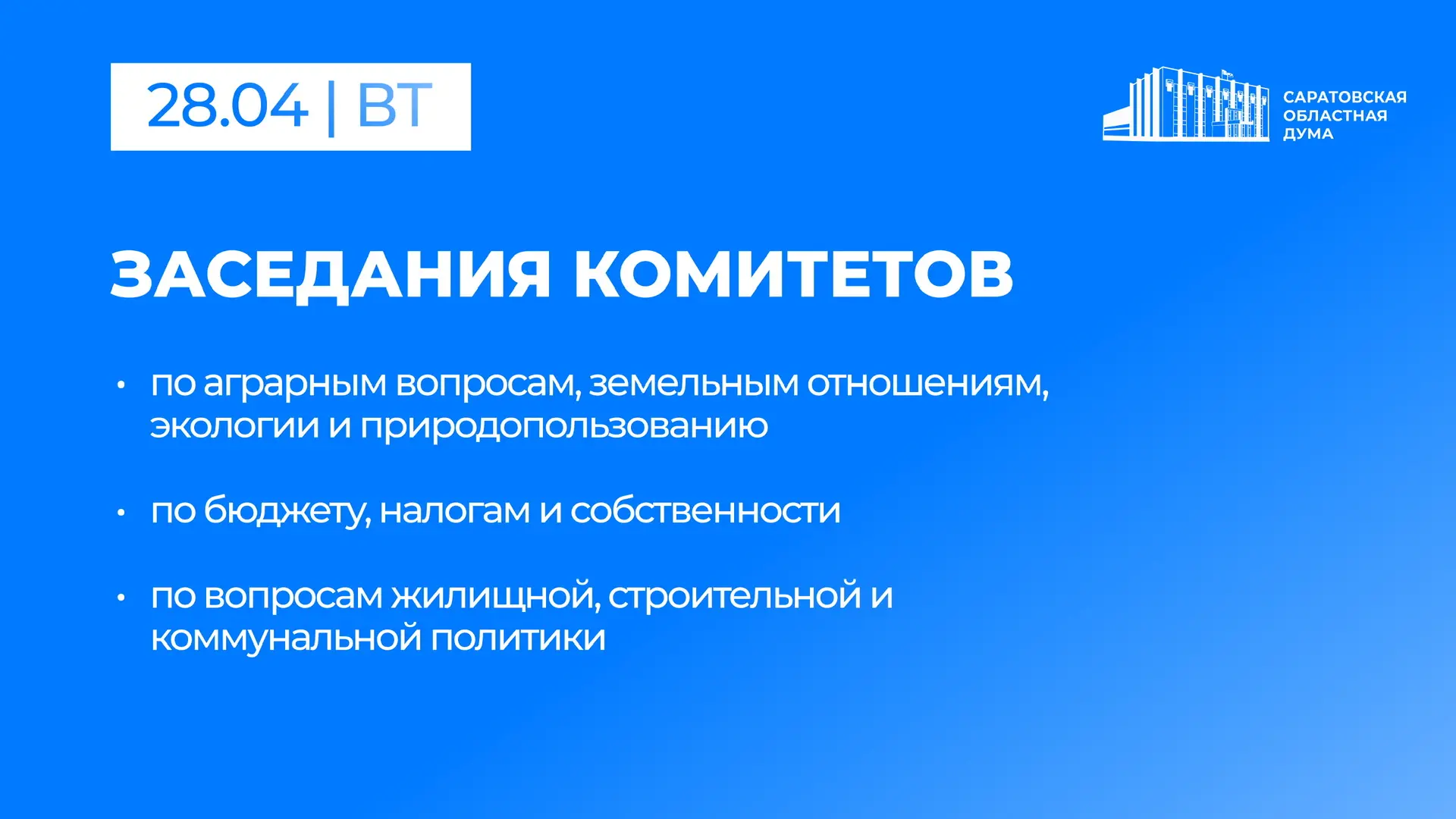 28 апреля в Саратовской областной Думе состоятся заседания комитетов: