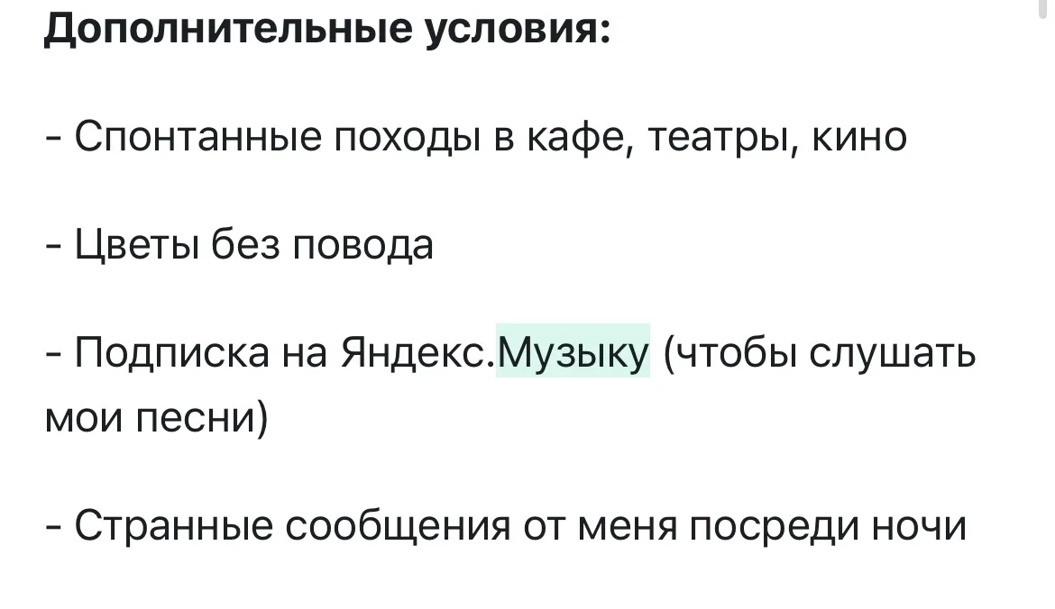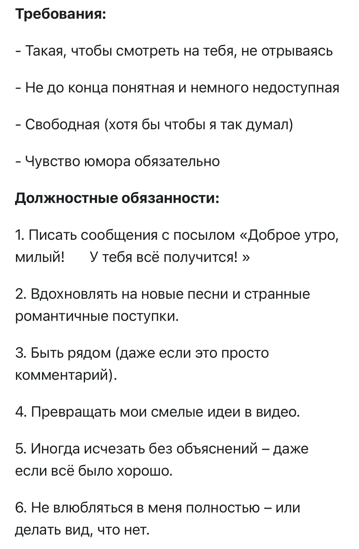 К должностным обязанностям работодатель отнес: написание милых сообщений, быть источником вдохновения на новые песни, находиться рядом, иногда исчезать без объяснений и не влюбляться полностью (или делать вид, что нет).